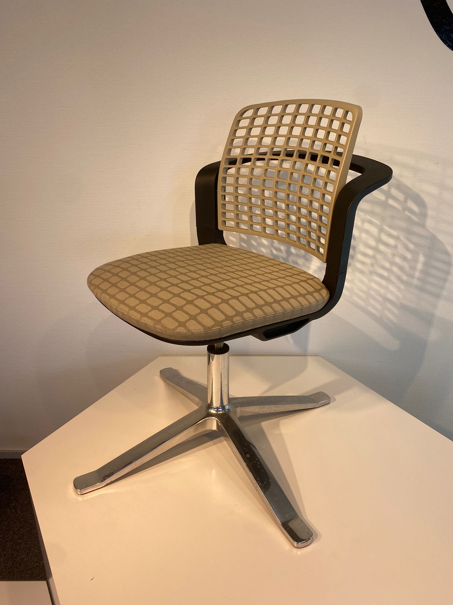 Myymälä – näyttelytuoli. Keinumekanismi + kiertyy/pyörii ristikko jalan ympärillä. Poistunut tuote. (Aikoinaan sh. 580,00)